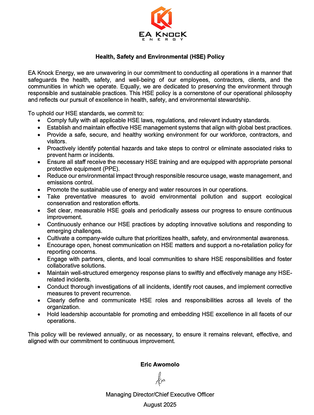 Health, Safety and Environmental Policy